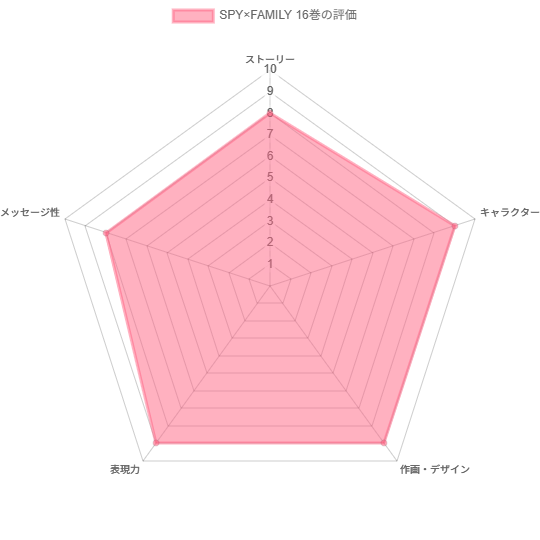 SPY×FAMILY 16巻について、以下の5つの観点で各項目10点満点で評価致します。