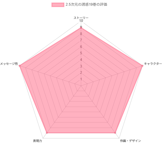 2.5次元の誘惑19巻について、以下の5つの観点で各項目10点満点で評価致します。