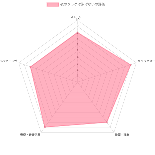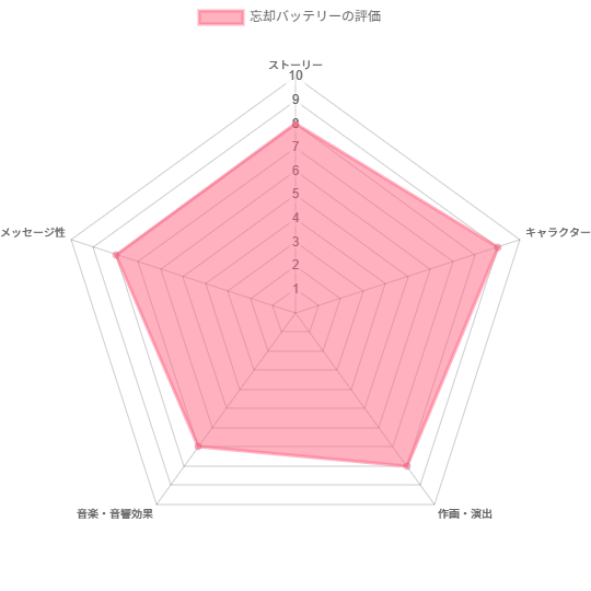 忘却バッテリーについて以下の5つの観点から各10点満点で評価致しました。