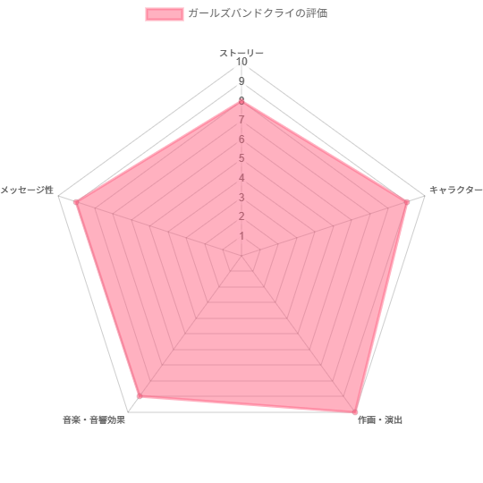ガールズバンドクライについて以下の5つの観点から各10点満点で評価致しました。