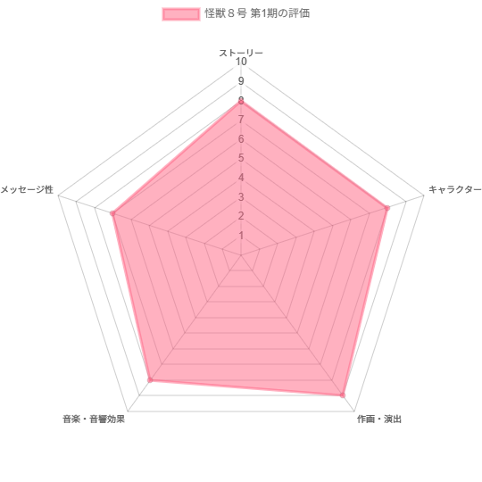 怪獣8号 第1期について以下の5つの観点から各10点満点で評価致しました。