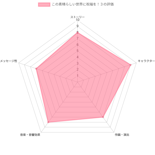 この素晴らしい世界に祝福を!3について以下の5つの観点から各10点満点で評価致しました。